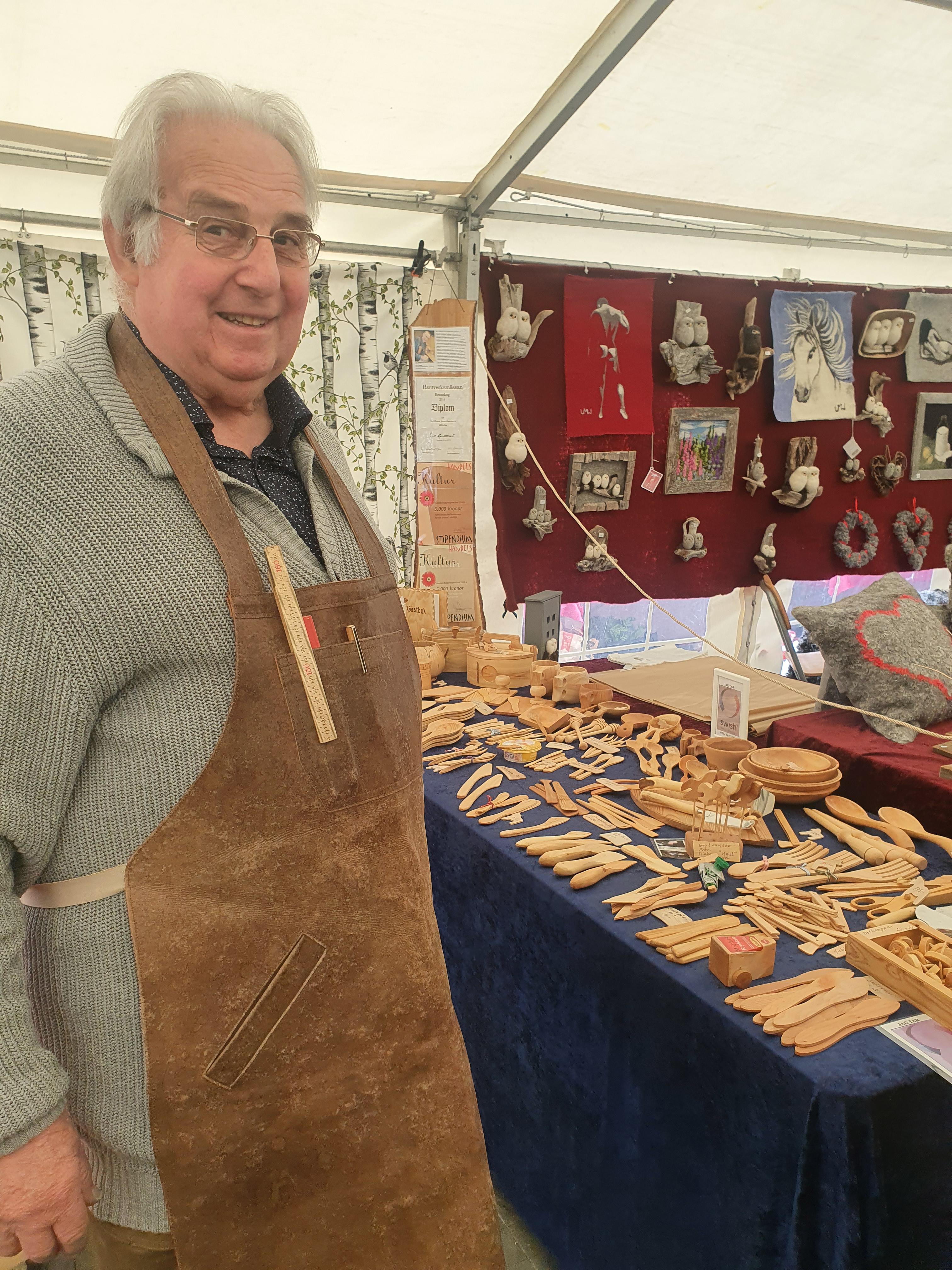 Konsthantverk i svepteknik, askar, fat och skålar samt praktiska bruksföremål i trä.